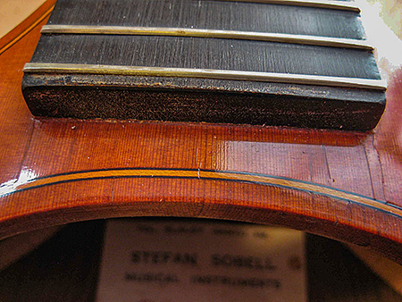 In September 1984 it received damage to the treble rib when the mandolin, in its case, was thrown at my by a very angry girlfriend. The depressed crack in the rib was caused by the hinge rivet as the case hit the wall. Stefan’s quote about it still appears on his ‘The things they say’ webpage..