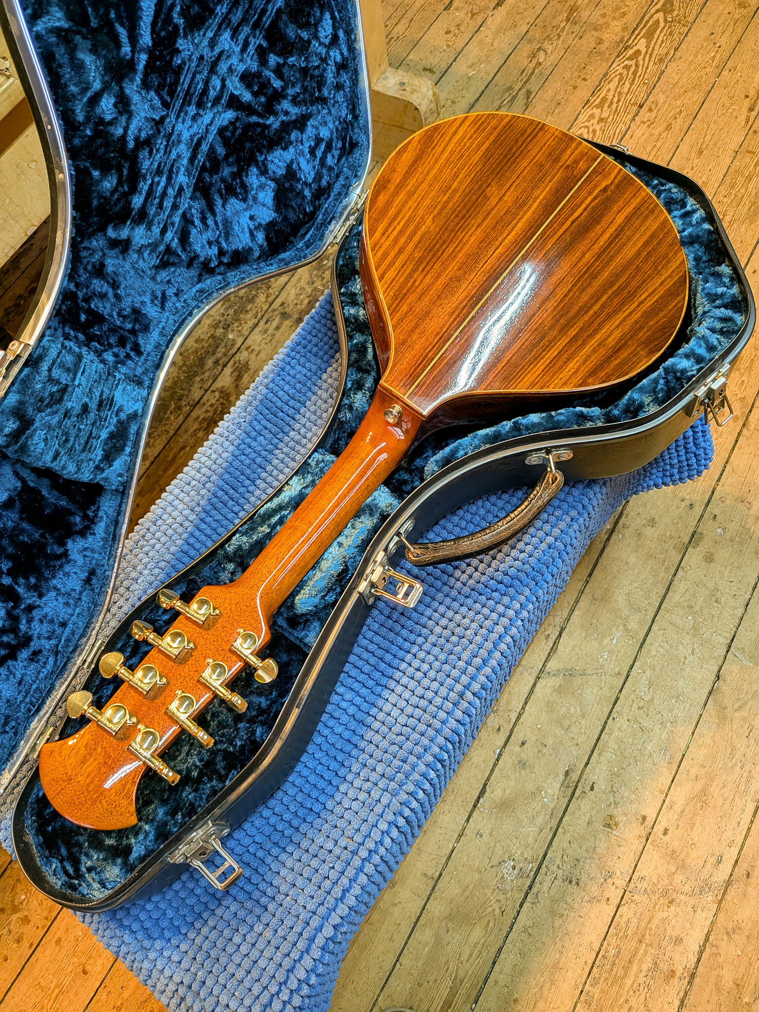 David Bell is selling his C1990 small mandolin. He brought it to show me and it’s in amazing condition. Back and sides are Indian rosewood, the soundboard is German spruce and the neck is Brazilian mahogany. Everything is perfect and unmarked, even the original Jack Clark case. It really is in ‘as new’ condition.