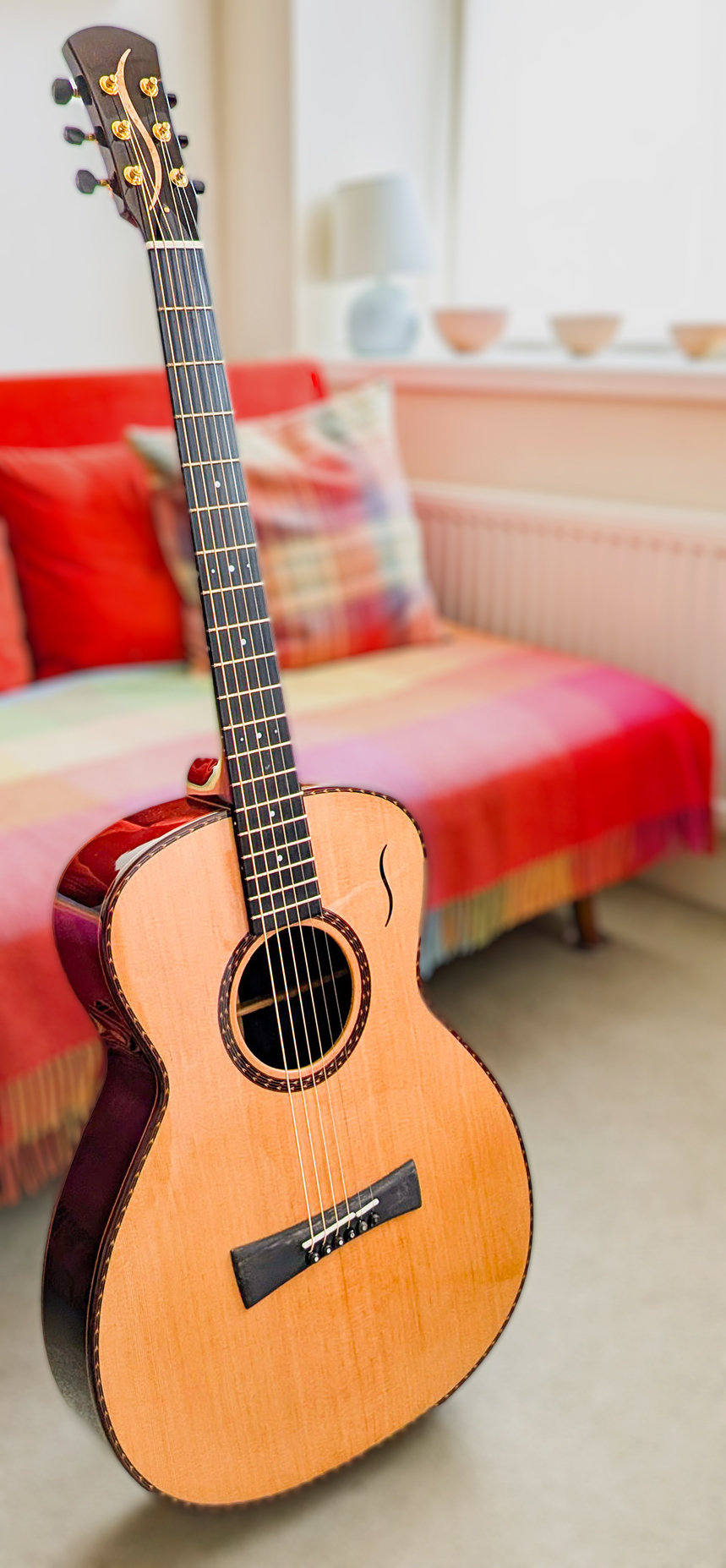 At this time I was inlaying a large stylised Birdseye Maple S into the headstock of my then new 40th Anniversary Model guitars, and a half size version into my other guitars’ headstocks.